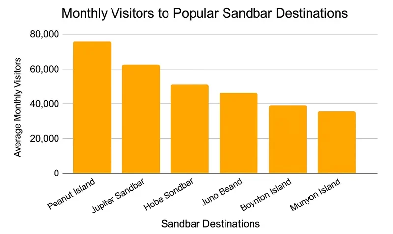 Visitor numbers show just how popular Peanut Island Sandbar is compared to other South Florida destinations. Here’s a quick look at average monthly visitors for the most well-known sandbars in the area: